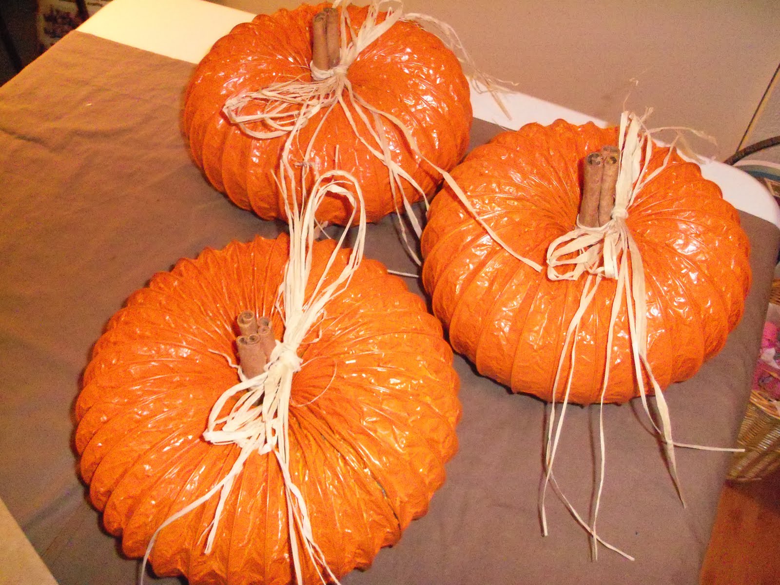 Believe it or not, these are made with aluminum dryer vent hose!! All you do is cut out your length of dryer hose, hot glue it together, then spray paint it orange. Then you add cinnamon sticks and a raffia bow. I plan on putting some of these outside for Halloween decorations.